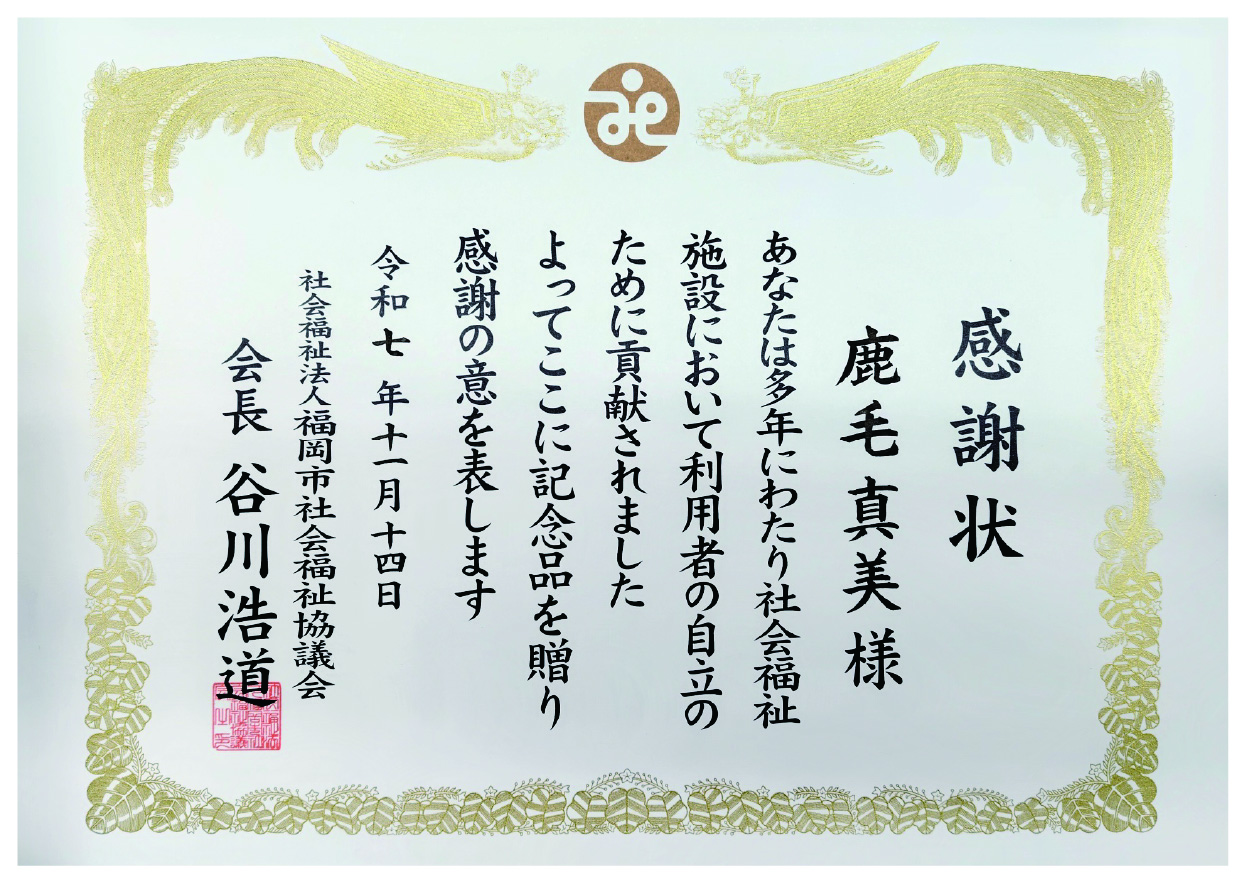 「このたびは感謝状を頂戴し、とても嬉しく思います。保育施設ご利用の皆様の自立を支える仕事の中で 私自身も周囲の方に支えていただく事で続けてこられたものです。恩送りの想いを大切に今後も励んでいきたいと思います。」