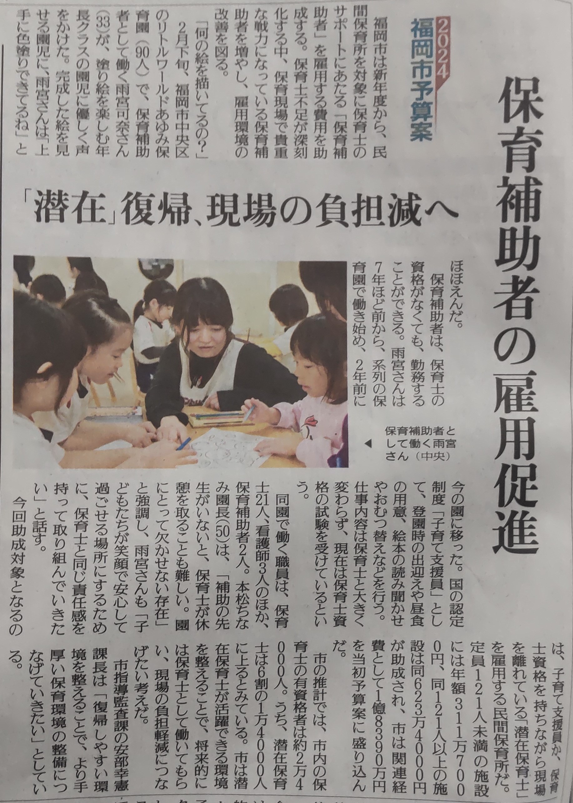 保育士不足が深刻化する中、保育現場で貴重な戦力となっている「保育補助者」。2024年の福岡市予算で補助者雇用の費用が助成されます。実際に現場で働く声として、リトルワールドあゆみ保育園の子育て支援員さんが読売新聞より取材を受け、記事が掲載されました。