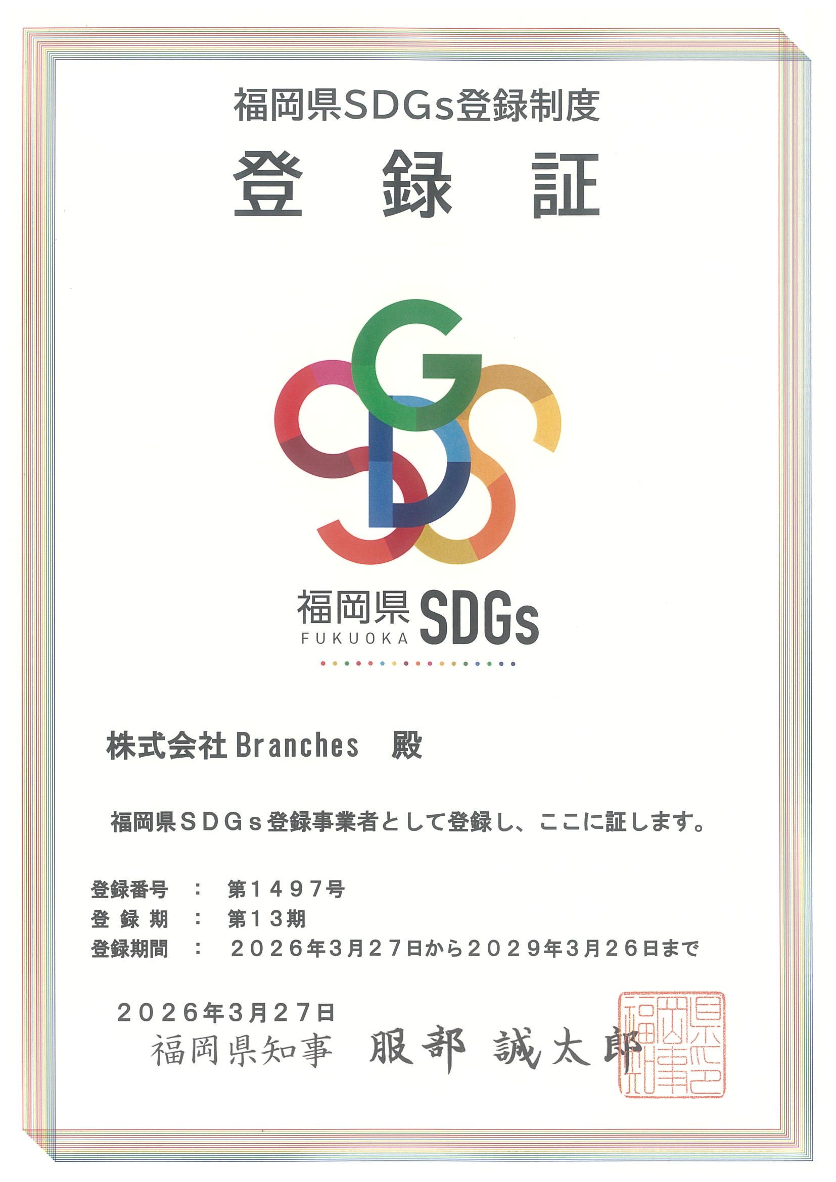 このたび福岡県が実施する「福岡県SDGs登録制度」に、株式会社Branchesの本社および福岡県内の全19事業所が登録されました。